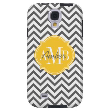 An eye-catching and chic monogram chevron case for your Samsung Galaxy S4 featuring a background chevron zigzag pattern in gray and white with a yellow text banner for your monogram initials and name. The initials are in white and the name is written over the initials in a coordinating gray.