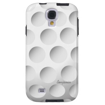 A fun and eye-catching golf-themed Samsung Galaxy S4 case featuring a close up image of a golf ball, showing the dimples on the ball. The case has customizable text to add the name of the keen golfer to create a personalized golfing gift.